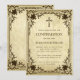 Esta invitación de confirmación vintage tiene un marco antiguo ornamentado con decoraciones barrocas elegantes y un fondo que simula pergamino. Sobre el texto hay una cruz religiosa. El texto, la cruz y el marco son de color marrón oscuro, casi negro, el fondo se asemeja al papel viejo. Todo el texto se puede personalizar.