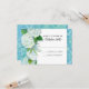 Con arte original pintado a mano y diseñado gráficamente por Audrey Jeanne. Tarjeta de respuesta de confirmación de asistencia para invitaciones de boda. Creado en estilo vintage pero con arte recién creado de remolinos de damasco en tonos de azul desde aqua hasta azul cielo. Las flores blancas de hydrangea caen en el borde del panel lateral del diseño. Derechos de autor, Audrey Jeanne Roberts.