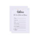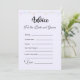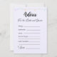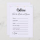 Presentando "Consejos para la novia y el Groom", un extraordinario juego de ducha de novias que va más allá del mero entretenimiento. Esta sincera actividad proporciona un espacio cálido y acogedor para que la familia, amigos y seres queridos ofrezcan sus consejos y buenos deseos sinceros a la pareja feliz de una manera segura y no confrontacional. Mientras se embarcan en su viaje de amor y unidad, la novia y el novio pueden recoger estos preciados mensajes, deleitándolos ahora y a lo largo de los años como un tesoro de su día especial. Las tarjetas incluyen la entrañable frase "Consejos para la novia y el novio" en una letra de escritura negra bonito, lo que da un aire de elegancia a cualquier ducha de novia, ducha de boda o celebración de bodas. El suave y cautivador fondo liviano morado crea un aura de romance y tranquilidad, simbolizando la pasión sin límites de la pareja y la promesa de una historia de amor de toda la vida. En la parte superior de cada tarjeta, una serie de delicadas luces colgantes le dan un toque de fantasía, lo que crea el ambiente perfecto para compartir sentidos e intercambios significativos. En cada tarjeta, se invita a los huéspedes a expresar su consejo bajo los epígrafes "Siempre", "A veces", "Nunca", "No olviden" y "Les deseo a los dos". Estos reflexivos instantes animan a los invitados a dar su sabiduría y bendiciones, que culminan en una colección de sentidos que la pareja debe apreciar. Ya sea que se imprima o se imprima profesionalmente en casa, "Consejos para la novia y el novio" se transforma en un inestimable recuerdo que soportará la prueba del tiempo. La pareja puede revisar estos entrañables mensajes, sirviendo como un recordatorio amoroso del apoyo duradero que los rodea mientras se embarcan en su viaje como recién casados. Incorporar "Consejos para la novia y el Groom" en su ducha de novias o evento de boda, y presenciar el profundo impacto de compartir en este significativo intercambio de consejos y amor. Este juego es un hermoso testimonio del poder del amor y la importancia de tener un sistema de apoyo amoroso mientras la pareja se embarca en su aventura de toda la vida juntos. Haga recuerdos sinceros y proporcione un espacio seguro para que sus seres queridos ofrezcan su guía y buenos deseos con "Consejo para la novia y el novio".