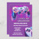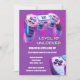 Un ilustracion moderno y fresco de un visor a través de un controlador de videojuegos de plástico púrpura, azul y rosa que tiene la edad de los chicas de cumpleaños en el panel digital se coloca contra un bokeh de neón rosa y morado que tiene plantillas en blanco sobre un fondo morado debajo que pueden ser personalizadas. Se encuentran dos controles adicionales en las esquinas delantera e inferior derecha. Son ideales para fiestas de jugadores y celebraciones de juegos. Ideal para adultos y niños.