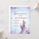 Elegant invitation for a debutante party in shades of purple with touches of glitter silver with an illustration of a dress.