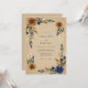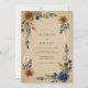 Deep navy blue and warm copper watercolor blossoms create a striking contrast against a textured tan background. Detailed roses and anemones are paired with soft sage green leaves and delicate white sprigs. This design captures a rustic autumnal atmosphere, ideal for an earthy woodland-themed event.