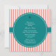 El diseño combina el color rosa del coral con las rayas blancas en el fondo. Un elegante patrón a rayas y en el centro hay un círculo verde azulado donde añadir el texto de tu invitación.