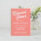 Las invitaciones a la cena son de estilo boda y sencillo, con letras blancas y estilizadas sobre un fondo de color coral moderno. Edite sus invitaciones reemplazando los nombres, fecha/hora, ubicación e información de contacto con la suya. Seleccione el tamaño de la invitación y el estilo de papel.