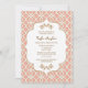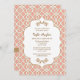 Elegante y hermosa ducha de inspiración francesa de inspiración marroquí con un repetido diseño de patrones geométricos de coral y oro y florecimiento floral de matices dorados. Esta invitación de lujo y de gama alta es perfecta para cualquier noche formal, exótica, marroquí, árabe o ducha de novia con temática de Aladdin. La parte posterior de estas invitaciones y invitaciones personalizados, de marco sofisticado, se pueden personalizar con el nombre del monólogo y evento de la novia en forma de quatrefoil y el diseño impreso de la cinta. Pintura y diseño © Chrissy H. Studios, LLC. Todos Los Derechos Reservados.