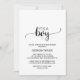 Esta tarjeta de invitación "es un niño", simple caligrafía negra y azul, es perfecta para una ducha de bebé rústica o moderna. El diseño minimalista de un niño pequeño presenta una tipografía moderna y un sutil corazón azul pastel. El respaldo presenta un patrón clásico de hojas y ramas.