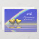 invitación del 50 aniversario de bodas dorado con mi diseño de un arcoíris y dos corazones dorados flotando en el agua azul.