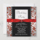 Elegantes invitaciones de fiesta de cumpleaños de cualquier edad con corbata de lazo de damasco plateado, rojo y negro para mujer. Este diseño elegante y sofisticado de damasco rojo y negro se personaliza fácilmente para su fiesta o evento. Tenga en cuenta que todos los diseños de invitaciones que encontrará en Zazzle son gráficos impresos en papel liso sin partes o piezas elevadas o añadidas.