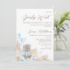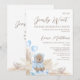 Corner Floral Boho We Can Bearly Wait Baby Shower Invitation Boy's podemos esperar a que el bebé llegue la invitación a la ducha de bebé con un moderno encabezado de caligrafía, un arreglo floral de color boho con rosas azules y pampas grass, un oso lindo vestido con un abrigo azul y globos en forma de corazón. Genial para la ducha de bebé de un niño que viene.