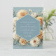 Experience a romantic union with this artistic design. A lush arrangement of creamy white and golden ochre chrysanthemums blooms against a serene cornflower blue background. The soft, painterly details create a timeless and elegant atmosphere for your special day.