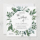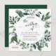 Invitación en formato cuadrado. Simple. Moderno. Elegante. Ideal para una boda en cualquier estación, este arte de follaje de bosque reunido en acuarela fue creado por la artista Audrey Jeanne Roberts. Características: hojas de eucalipto, eucalipto sembrado, helechos y hojas en esmeralda rica, verde bosque. Derechos de autor.