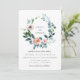 Bella corona de follaje de jardín y flores delicadas en acuarela, invitación de boda. La parte trasera de la tarjeta presenta un color azul polvoriento sólido.