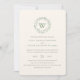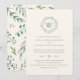 Invitación de boda de papel sencillo y elegante con tipografía clásica, corona de greenery de acuarela con monograma.
