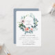 Bella corona de follaje de jardín y flores delicadas al estilo acuarela, invitación de boda. La parte trasera de la tarjeta presenta un color azul polvoriento sólido.