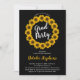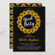 Invitaciones a la fiesta de graduación boho con corona de girasoles soleados y patrón dorado y negro. Diseño original de Holiday Hearts Designs (todos los derechos reservados).