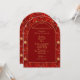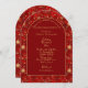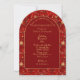 A beautiful corporate annual Christmas party invitation on a red and gold floral background, using the arch shape card and arch gold elements.