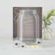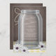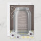 Impresionantemente hermosas invitaciones de boda inspiradas en el país del sur, con un ilustracion de un frasco de albañil con dos cuerdas atadas alrededor del cuello, mareas blancas y violetas tendidas a los pies del frasco, sobre un fondo marrón vintage, y una mesa de gingham amarilla. Los detalles de su boda están contenidos en el frasco de vidrio, donde si su texto se extiende a la sombra del frasco, el texto también será sombreado. El reverso de estas invitaciones permite imprimir la hora y la ubicación de la recepción.