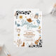 Saddle up for a rootin tootin celebration with this western cowboy birthday party invitation! Featuring classic western icons like cowboy hats, boots, lassos, cacti, and a sheriffs badge against a bold cow print background, this design sets the perfect tone for a fun-filled day. Ideal for kids birthdays, especially little cowboys and cowgirls, this invitation blends rustic charm with playful details to delight guests. Personalize with your party details and make your childs birthday unforgettable with this unique cowboy-themed invite.
