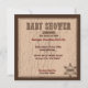 Diseño rústico occidental con mecedora de caballo, cuerda, insignia del sheriff y elementos de costura de montura para una tarjeta de invitación a la ducha de bebé.