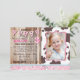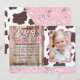 Tarjeta de invitación de cumpleaños con temática occidental de lechera con tiras de bandana rosada, fondo rústico de madera de tablero y racimo fiesta.