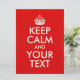 Crea una invitación para una fiesta de cumpleaños personalizado con una parodia del poster clásico "Keep Calm and Carry On". Usted es personalizar o personalizado con estilos de fuente diferentes, un color de fondo diferente, incluso un color de fuente diferente. En este momento atrás hay texto rojo mientras que en el frente hay un fondo rojo con corona blanca y fuente.