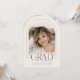 Introducing our cream and charcoal gray arch photo graduation announcement—a sleek, modern keepsake designed with minimalist elegance. The front features an arch-shaped photo with a thin border and the word "grad" partially overlaying the photo. Personalize the template by adding your graduation year, name, and school to create your announcement with ease. On the back, upload 4 more of your favorite photos. © Kimbellished, LLC