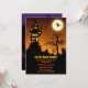 Una casa aterradora encaramada sobre una colina con un patio de sepultura contra un oscuro cielo naranja. Hay una luna llena con una bruja malvada volando sobre ella. Diseño muy divertido y aterrador para tus invitaciones a la fiesta de Halloween.
