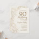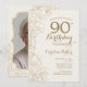 Floral Marfil Cream Gold Fotografía 90th Birthday Party Invitation. Diseño moderno minimalista con acentos de dibujos botánicos y tipo de letra de guión tipográfico. Sencilla carta de invitación a la moda, perfecta para una elegante celebración de cumpleaños femenina. Se puede personalizar a cualquier edad. Invitaciones Zazzle impresas o una plantilla imprimible digital de descarga instantánea.