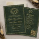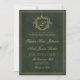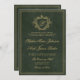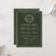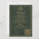 Vintage elegant monogrammed classic formal traditional wedding invitation with QR code to website for guest information details and RSVP, faux gold frame and antique calligraphy script over a distressed looking dark emerald green background. +++++++++++ Suitable for timeless classy old money themed weddings.