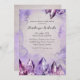 Esta invitación de fiesta personalizada presenta una curación y meditación lujosa. Los cristales de amatista de estilo acuarela en varios tonos de morado están representados a lo largo de la parte inferior y la esquina superior derecha. Estos poderosos cristales curativos están acentuados con una tinta de color amatista morado a juego y motas de purpurina. Es perfecto para un baby shower, cumpleaños u otro evento especial.