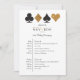 Más fácil de leer, esto es perfecto para un viaje corporativo a Las Vegas o un evento con tema de casino, esta tarjeta de cronograma presenta brillo dorado falso y palos de cartas negras sobre un fondo blanco con texto totalmente personalizado y un respaldo coincidente.