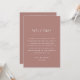 Bienvenidos a sus invitados con esta elegante tarjeta de itinerario de línea de tiempo de fin de semana de boda en rosa polvoriento. El tono suave y romántico añade un encanto atemporal, lo que la hace perfecta para bodas de primavera, verano, otoño o invierno. Con su diseño limpio y minimalista, esta tarjeta mantiene claros y bellamente presentados los eventos de su fin de semana. Una encantadora adición a su bolsa de bienvenida o conjunto de papelería. Ideal para celebraciones rústicas, boho, de jardín o clásicas. Disponible como tarjeta impresa o práctico descargable digital.