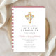 Tarjeta de Invitación Personalizada De La Primera Comunión De La Cruz De La Corona Floral Rosa.