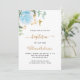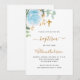 Un fondo blanco decorado con vegetación de eucalipto, una rosa azul claro y hojas doradas. Personalice y el nombre del niño y los detalles de la ceremonia. Letras de color negro y dorado.