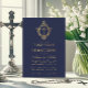 Esta elegante invitación de primera comunión de color azul marino y dorado con un aire vintage, recomendada para un niño, tiene un blasón floral vintage en hojalata dorada, que tiene una cruz en su interior, también en hojalata dorada. El nombre del niño está escrito en una elegante letra caligráfica. Todo el texto se puede personalizar y tiene un color dorado similar al blasón de hojalata dorada. El fondo es azul marino.