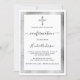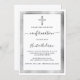 Moderna, elegante e invitada. Un fondo blanco decorado con una falsa cruz de plata y marcos falsos de plata. Personalice y agregue un nombre y detalles. Texto negro.