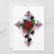 Cruz de plata con rosa roja y hojas negras sobre fondo blanco.