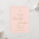 Una elegante invitación de bautizo con una firma de nombre con letra cursiva chic. Personalice con la información especial de su bautizo en letras doradas sobre un fondo rosa y código QR y detalles de recepción en el reverso. Diseñado por Thisisnotme©