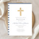 Invitación al bautismo de niño con rayas azules de cruz religiosa personalizada.