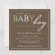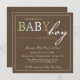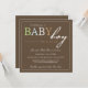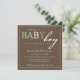 Esta invitación hermosa de la fiesta de bienvenida al bebé ofrece las palabras "bebé" en sombras infantiles en un fondo del marrón oscuro.