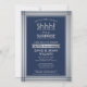 ¡Shhh! ¿Puedes guardar un secreto? Invite a la familia y amigos a una celebración elegante y emocionante con esta invitación de aniversario sorpresa de color azul marino y plata. El diseño presenta Relieve metalizado de imitación plateado, rayas modernas y una elegante tipografía de inspiración Art Déco. Tenga en cuenta que la plata es de color gris claro impreso, no de Relieve metalizado metálico. Esta tarjeta está preparada para el 25º aniversario del boda, pero todo el texto es sencillo para el personalizar para cualquier año o ocasión.