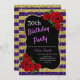 Elegante morado, purpurina de rayas doradas y rosales rojas invitan a las mujeres de cualquier edad. Se puede cambiar la edad para cualquier edad. El texto se puede cambiar a cualquier cosa para que se ajuste a su evento. ¡Las fuentes, el color de la fuente y el texto son completamente personalizables! La forma y el tipo de papel se pueden personalizar para adaptarlo a su presupuesto y a su gusto.