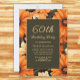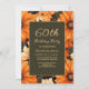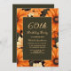 Invitación a la fiesta de cumpleaños número 60 decorada con flores naranjas y crema de fondo marrón. Estas invitaciones pueden ser personalizadas para cualquier persona de cualquier edad. Contáctame para obtener ayuda con tus personalizaciones o para solicitar productos adicionales de correspondencias o coordinación de Zazzle para tu celebración.