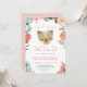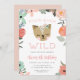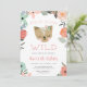 Las invitaciones para los cuatro años de tu vida salvaje incluyen un borde floral boho y un gatito con queso color rosa dulce adornado con flores. "Cuatro salvajes de la historia" aparece en letras de melocotón, con los detalles de tu fiesta de cumpleaños debajo.