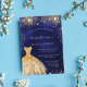 Una invitación de moda y glamurosa para una fiesta de 15 años en Quinceañera. Un fondo azul marino con un polvo falso purpurina de oro y un vestido. El color azul es desigual. El nombre está escrito con una escritura de estilo con letras a mano moderna. Personalice y agregue los detalles de su fiesta.