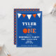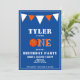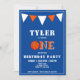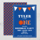 Invitación de cumpleaños 1º Baloncesto Azul. Tarjeta de cumpleaños de baloncesto linda para el primer cumpleaños. El diseño tiene un baloncesto grande y banderas de banderín en colores naranja y blanco sobre un fondo azul. Personalice esta invitación de cumpleaños con el nombre de un niño y una foto y personalice todos los datos en la invitación. Ideal como invitación de cumpleaños para niño de 1 año.