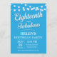 Invitación de cumpleaños 18 con luces de cuerda Fondo azul. Cumpleaños de mujer. Decimoctavo y fabuloso. Cualquier edad. Para una mayor personalización, haga clic en el botón "Personalizar" y use nuestra herramienta de diseño para modificar esta plantilla.