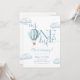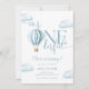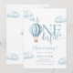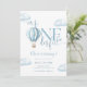 Esta encantadora invitación de cumpleaños número uno presenta un lindo globo aerostático azul y nubes, junto con tipografía de letra elegante. Diseñado por Thisisnotme©