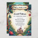 Esta elegante invitación de cumpleaños de estilo cuento de hadas es perfecta para un cumpleaños moderno. El diseño retro presenta un bosque encantado vintage, una ilustración de un castillo y caligrafía negra en un fondo temático de libro de cuentos.