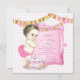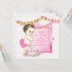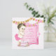 Fondo de perla rosa con pancartas rosas y doradas y adorables invitaciones de cumpleaños vintage para la primera fiesta de cumpleaños de la bebé. Esta adorable invitación de cumpleaños rosa se personaliza fácilmente para su evento agregando sus detalles en el estilo de fuente y color, redacción y diseño de su elección.